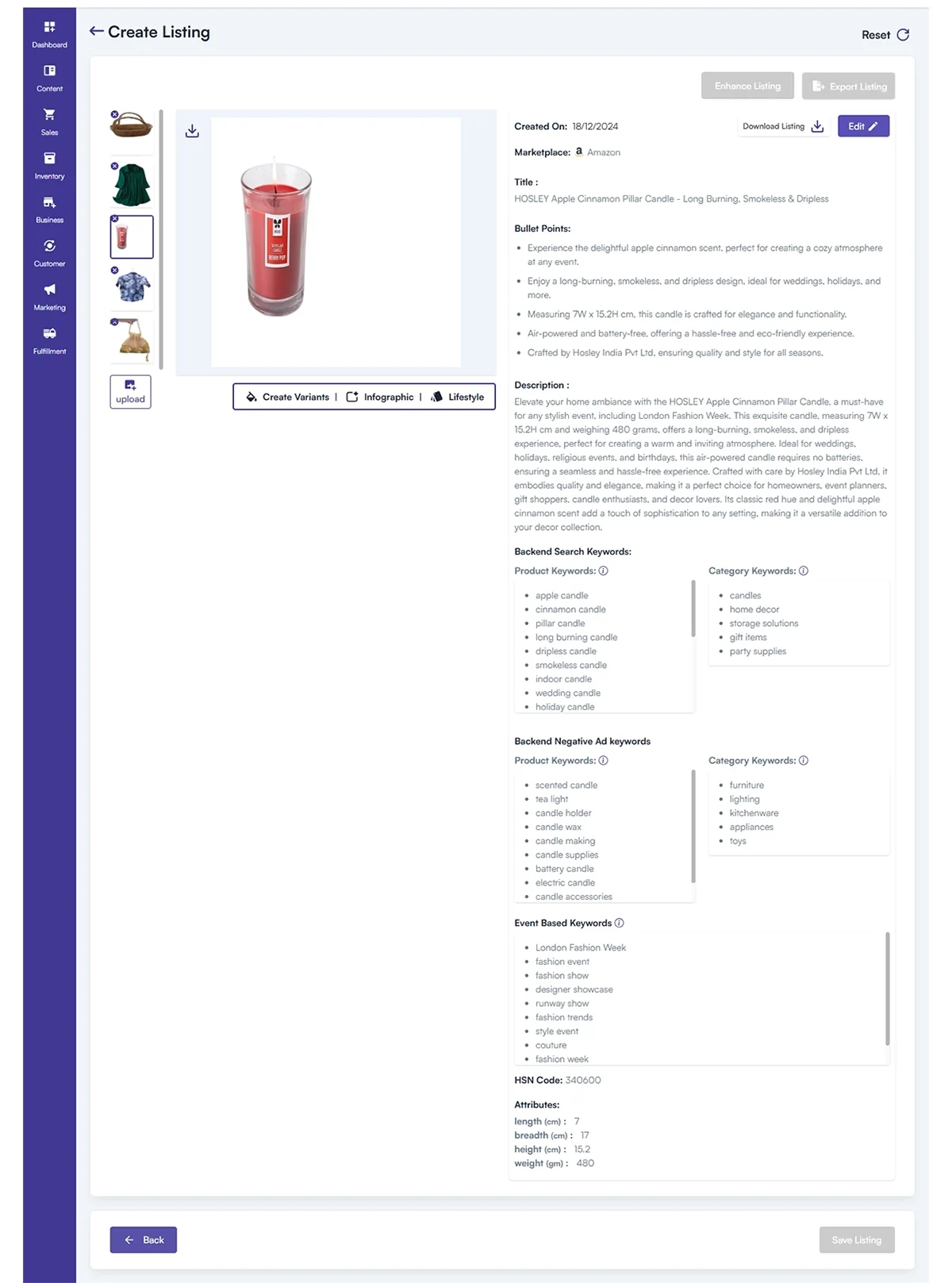 Automatically generated attributes and HSN codes streamline the listing process for regulatory compliance and marketplace integration.