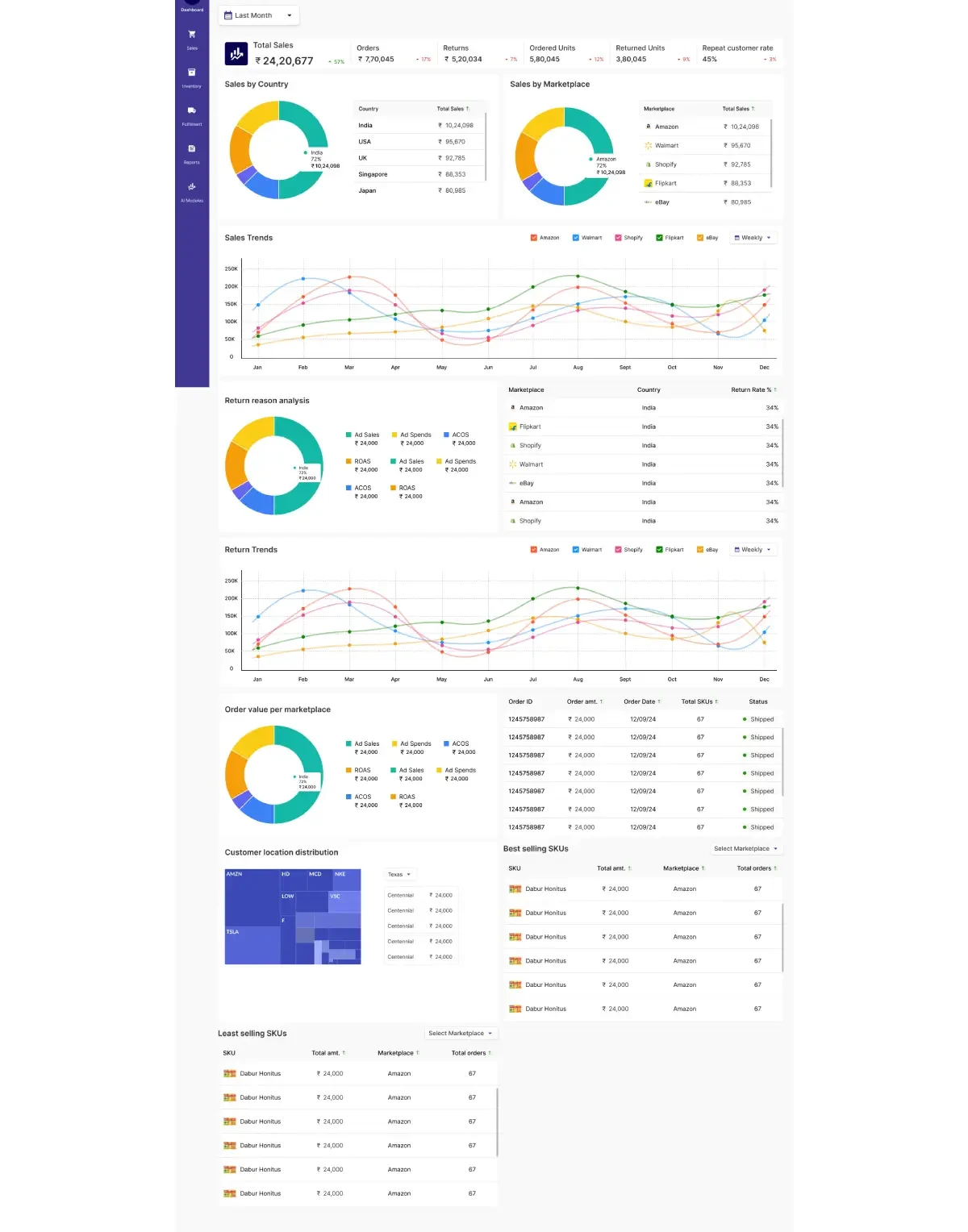 Sellers often lack visibility into sales and performance metrics across channels. Our platform provides comprehensive AI-powered analytics to inform better decisions.